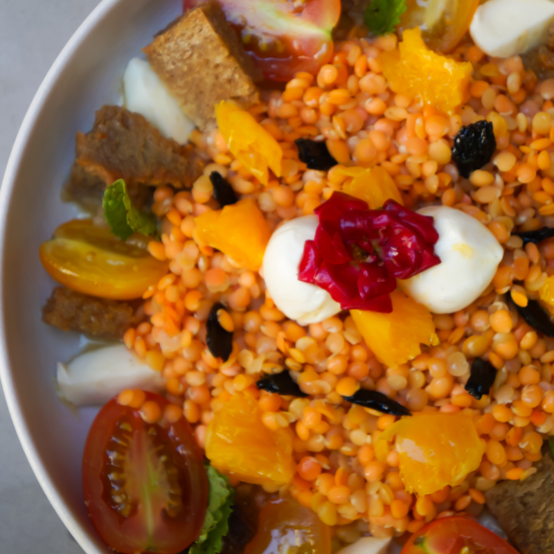 Ensalada de lentejas turcas con boconccino, crutones de pan negro, naranja, cherrys y aceitunas griegas