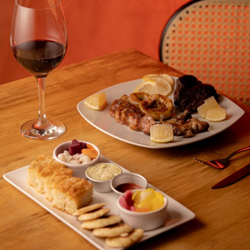 Una opción de picoteo caliente para 2 personas que trae: molleja, chinchulin, chorizo morcilla criolla, una mini provoleta; sale acompañado con dips de salsas y variedad de panes