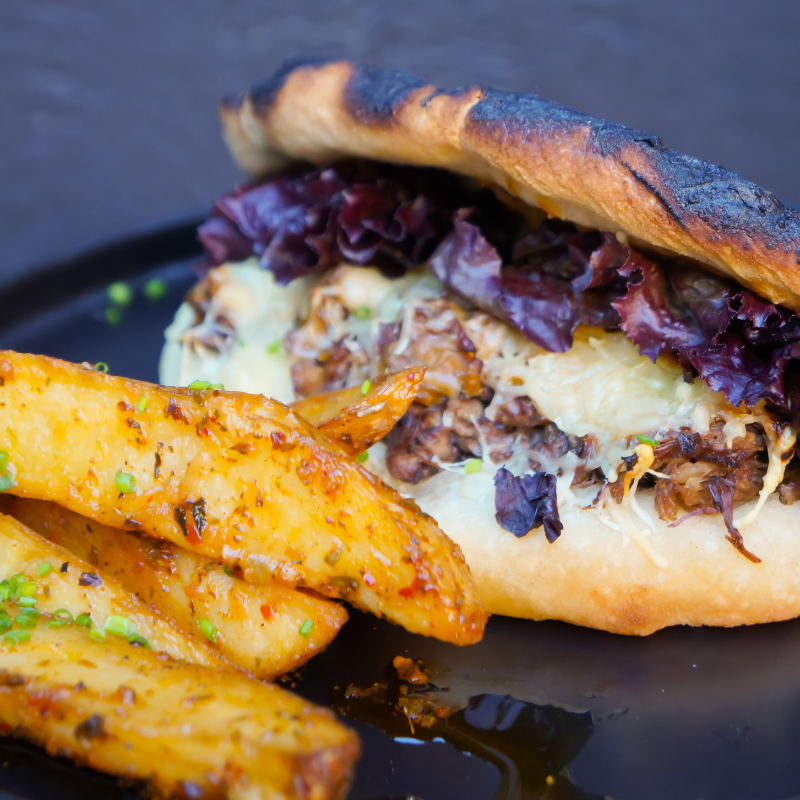 Sandwich en pan de masa madre con carne desmechada acompañado de un dip de salsa